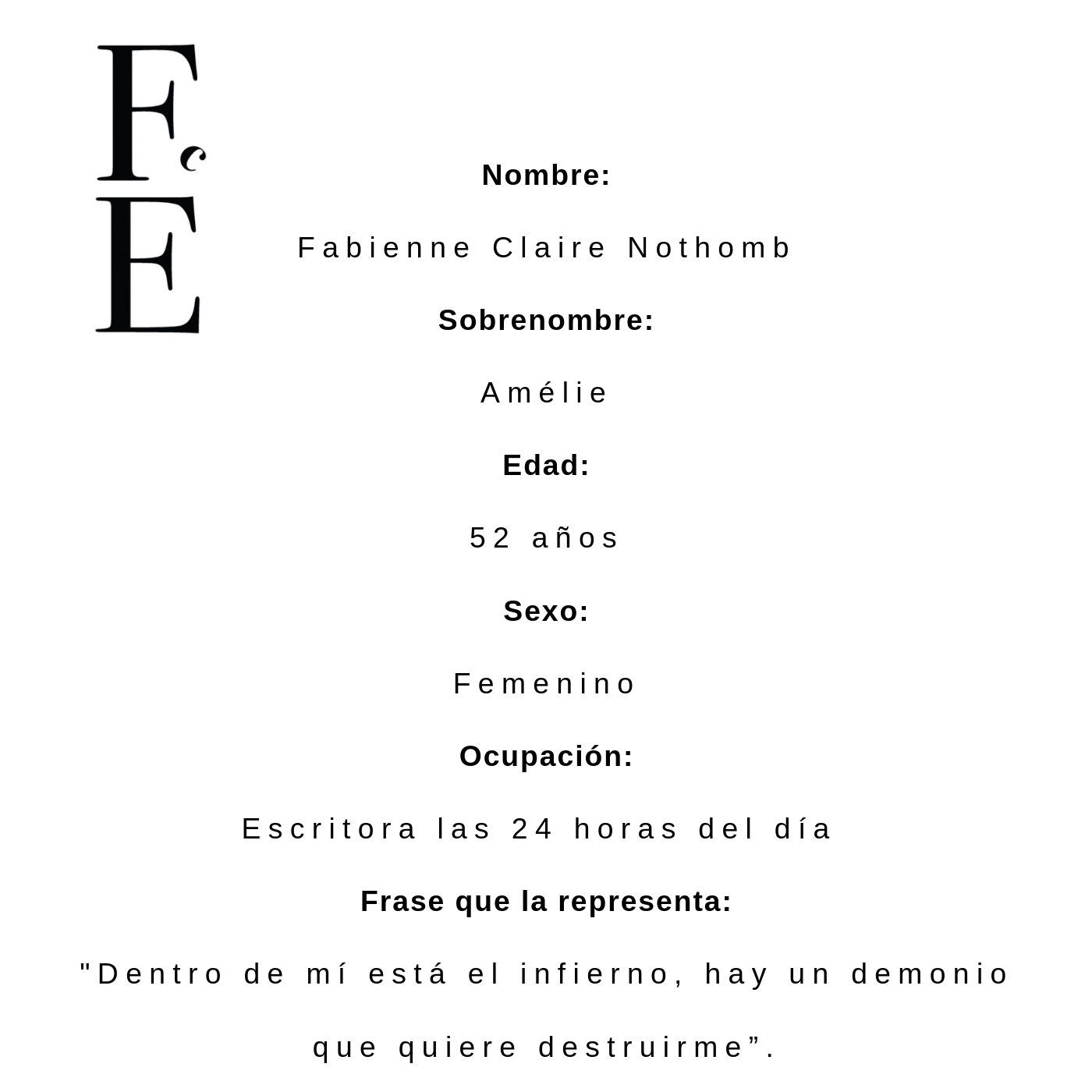 A media mañana se coloca en personaje, se viste de Amélie Nothomb: riguroso negro de pies a cabeza, sombreros extravagantes, casi como salida de una película de Tim Burton. De cabello oscuro y piel excesivamente blanca, labios rojos… una imagen que aparece por lo general en las portadas de sus libros y, por qué no, en la fachada que se inventó para poder sobrevivir.