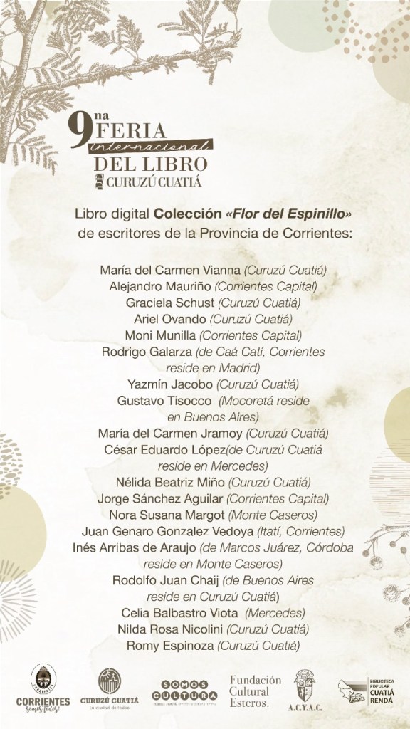 En el marco de la IX Feria Internacional del Libro de Curuzú Cuatiá, que se llevará a cabo del 19 al 23 de agosto de 2020, se realiza el Encuentro Esteros que reúne a 23 poetas internacionales de 19 países, junto a veinte poetas correntinos. Por primera vez la Feria del Libro de Curuzú será virtual y digital, lo que posibilita una inmensa apertura al mundo. Además, también es la primera vez que la feria editará una colección de literatura, principalmente poesía. La colección Flor del espinillo editará 20 libros digitales gratuitos que se podrán descargar de la web de la municipalidad de Curuzú Cuatiá y, desde aquí, en la Fundación Cultural Esteros.