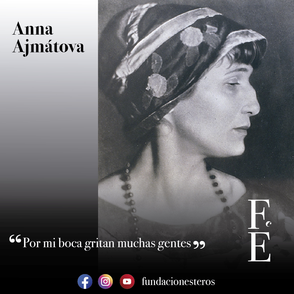 Anna Andréievna Gorenko nació el 23 de junio de 1889 en un pueblo cercano a Odessa, hija de una noble familia de origen tártaro, Ajmat, de la cual tomó el apellido por el que la conocemos. Estudió latín, historia y literatura en Kiev y en San Petersburgo. Allí se casó con Nikolái Gumiliov en 1910, promotor del acmeísmo, corriente poética que se sumaba al renacimiento intelectual de Rusia a principios del siglo XX. Los acmeístas rompían con el simbolismo, de carácter metafórico, y restablecían el valor semántico de las palabras.