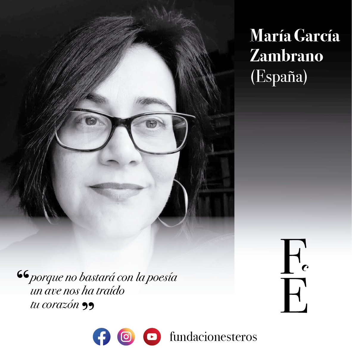 María García Zambrano (Elda, España, 1973). Licenciada en Periodismo por la Universidad de Sevilla, con estudios de doctorado en Letras Modernas en la Universidad Paris-Diderot. Actualmente es profesora de literatura en un instituto madrileño, e imparte el taller de poesía Nombrar el secreto, en la Fundación Centro de Poesía José Hierro. Forma parte de la Asociación de mujeres poetas GENIALOGÍAS. Ha publicado: «El sentido de este viaje» (Aguaclara, 2007); «Menos miedo», Premio Carmen Conde de poesía, (Torremozas, 2012), finalista al premio Ausiàs March al mejor poemario del 2012, «La hija» (El sastre de Apollinaire, 2015) y «Esta ira» (Vaso Roto, 2023). Sus versos aparecen en revistas como Turia, Nayagua o El Cultural. Ha sido traducida al portugués y al rumano.
