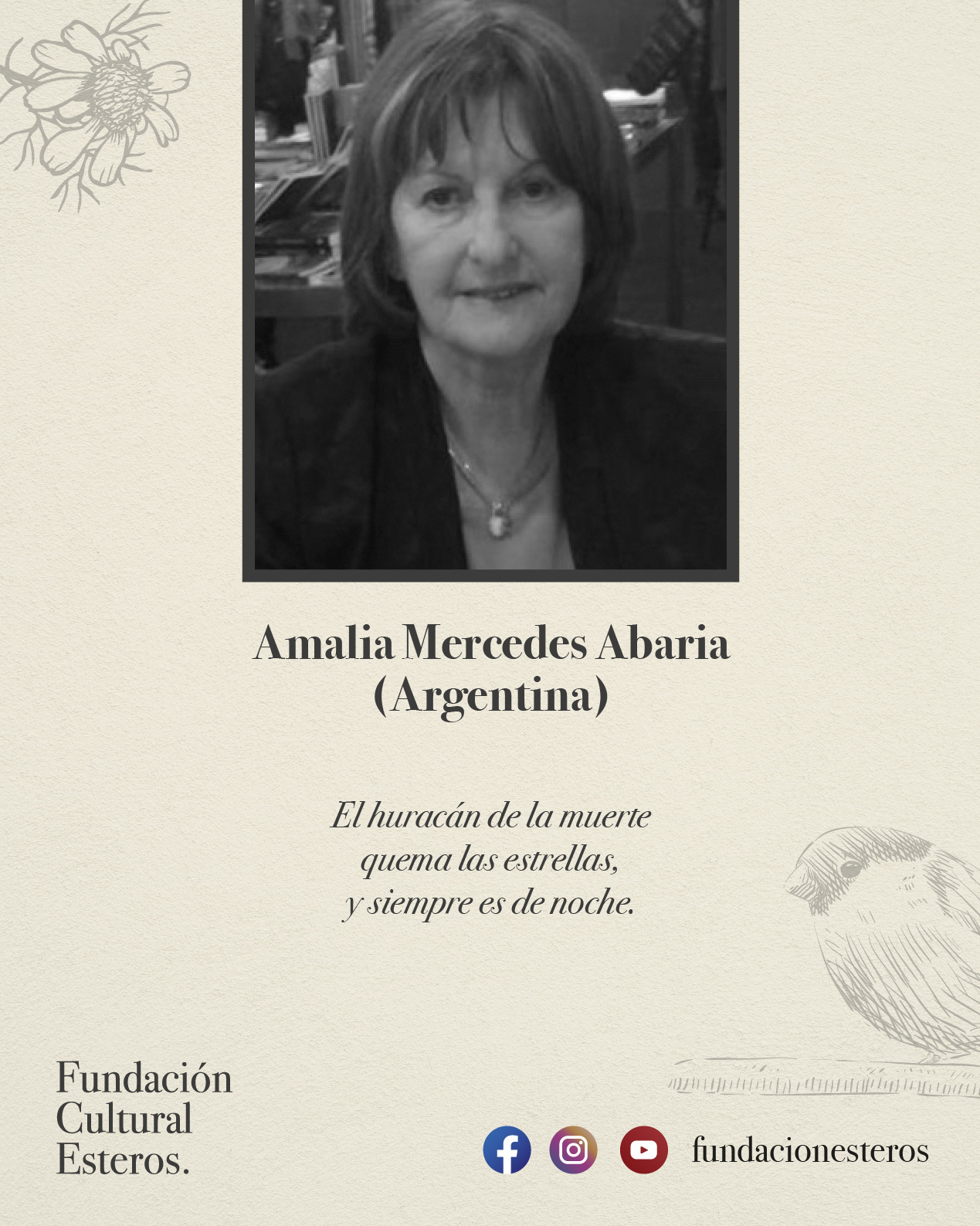 Amalia Mercedes Abaria. (Buenos Aires, Argentina). Artista plástica y escritora. Ha publicado los poemarios: «Del lado de la vida»; «Caminos»; «El musgo y la calma»; «Breves azules»; «Busco un agua»; «Necesidad del silencio»; «Plegarias en la noche larga» y «HAIKU». Además, de Tres libros de narrativa y uno de ensayo. Ha recibido varios reconocimientos, entre los que destacan el Primer Premio Poesía Internacional “Concurso Hespérides”, en 2018. Sus poemas han sido publicados en diversas antologías, diarios y revistas. Actualmente codirige el grupo de difusión poética «El silencio creador» y Administra el blog de difusión poética «El silencio y el poema».