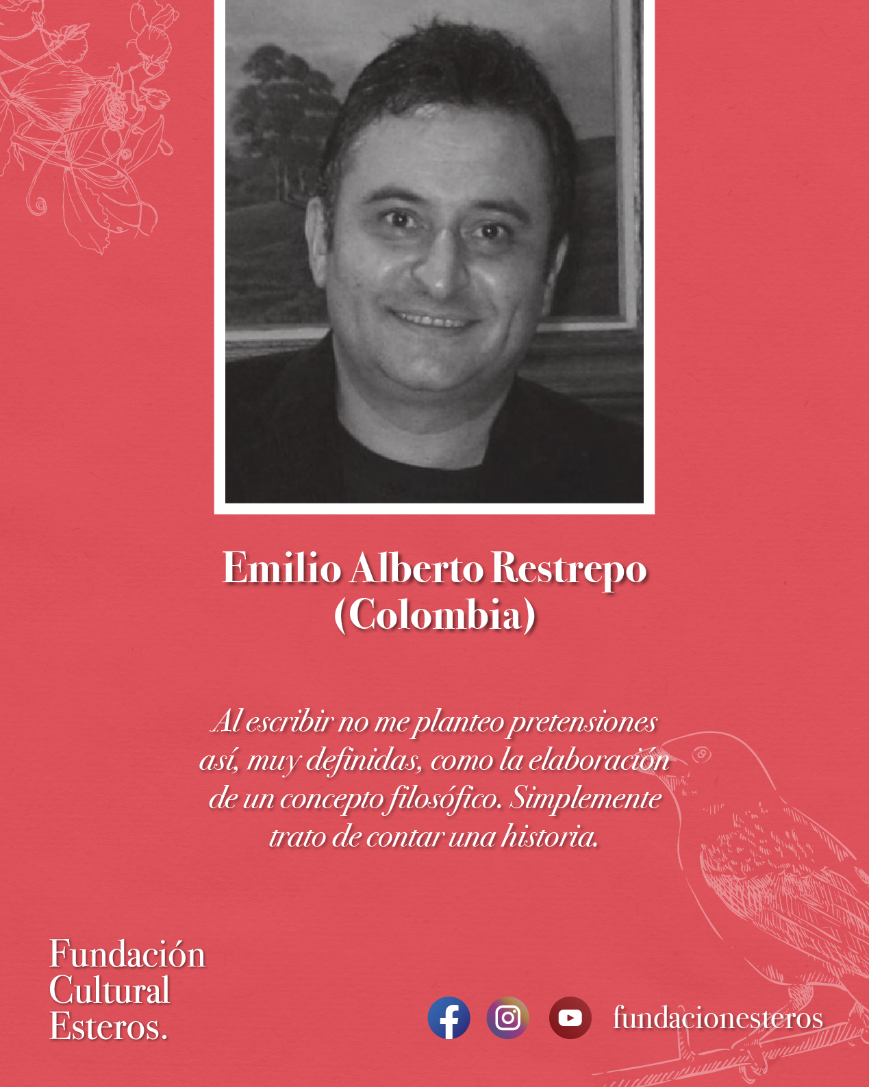 Emilio Alberto Restrepo. Médico, especialista en Ginecoobstetricia y en Laparoscopia ginecológica (UPB, UdeA, CES, respectivamente). Profesor, conferencista de su especialidad. Autor de cerca de veinte artículos médicos. Ha sido colaborador de los periódicos La Hoja, Cambio, El Mundo, Momento Médico, Universocentro, Revista Cronopio, Laterales Magazine y Ficción la Revista. Ha publicado novelas, colecciones de cuentos, libros de pedagogía y ensayos literarios. Ganador y finalista en concursos de poesía, cuento y novela. Autor de cerca de 20 libros. En su producción se destacan novelas de asuntos médicos y hospitalarios, novelas y cuentos de género negro y temática urbana, libros infantiles, pedagógicos y de ensayo literario. Con la Editorial UPB ha publicado, desde 2015, seis novelas de su personaje, el detective Joaquín Tornado.