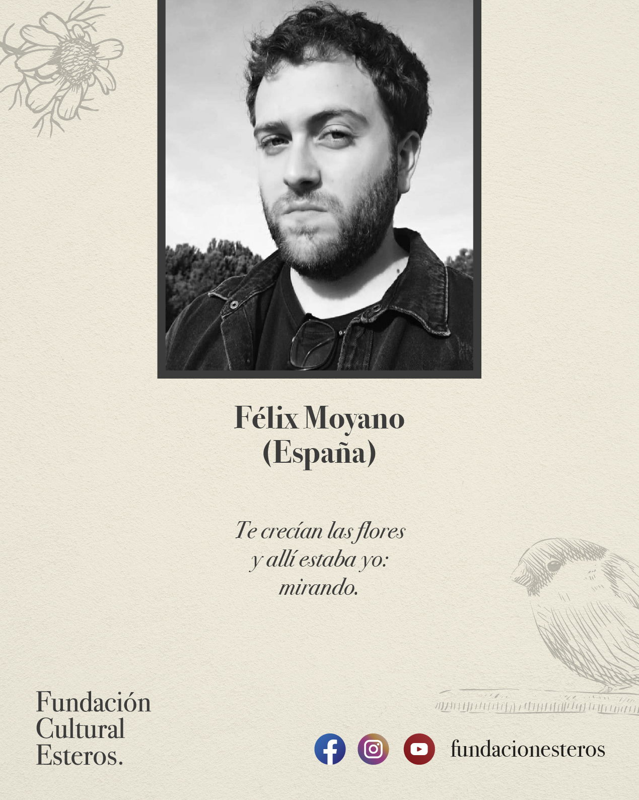 Félix Moyano (Córdoba, 1993). Doctor en Literatura Española e Hispanoamericana por la Universidad de Salamanca. Ha publicado «Insostenible» (II Premio Valparaíso de Poesía; Valparaíso Ediciones, 2017), «Los amores autómatas» (XXXIV Premio Andaluz de Poesía «Villa de Peligros»; Diputación de Granada, 2019) y «La deuda prometida» (Accésit de la 75ª edición del Premio Adonáis de Poesía; Rialp, 2022). En 2023 resultó ganador del XV Premio de Poesía RNE con su libro «Cuando llegue la hora» (Pre-Textos, 2023). Ha sido incluido en varias antologías dentro y fuera de España.