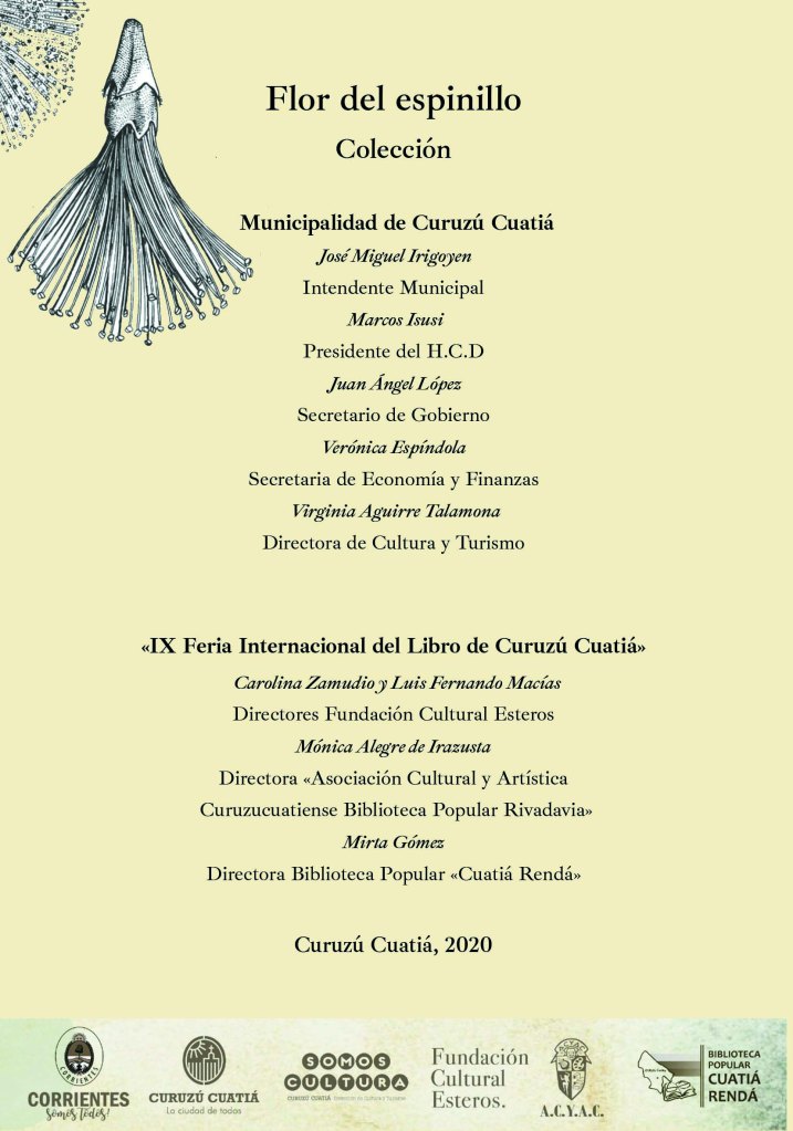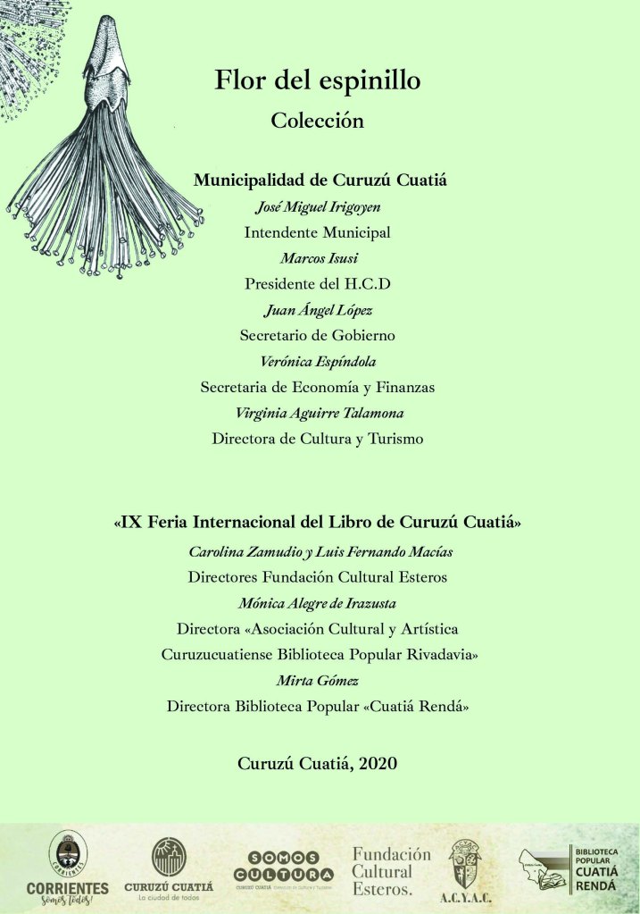 Con mucho entusiasmo presentamos la “Colección Flor del Espinillo”, conformada por veinte libros digitales dobles. Participan de ella treinta y nueve autores de diecinueve países y, particularmente, de la provincia de Corrientes, Argentina, sede virtual del “Encuentro Esteros” y de la “Novena Feria Internacional del Libro de Curuzú Cuatiá”.